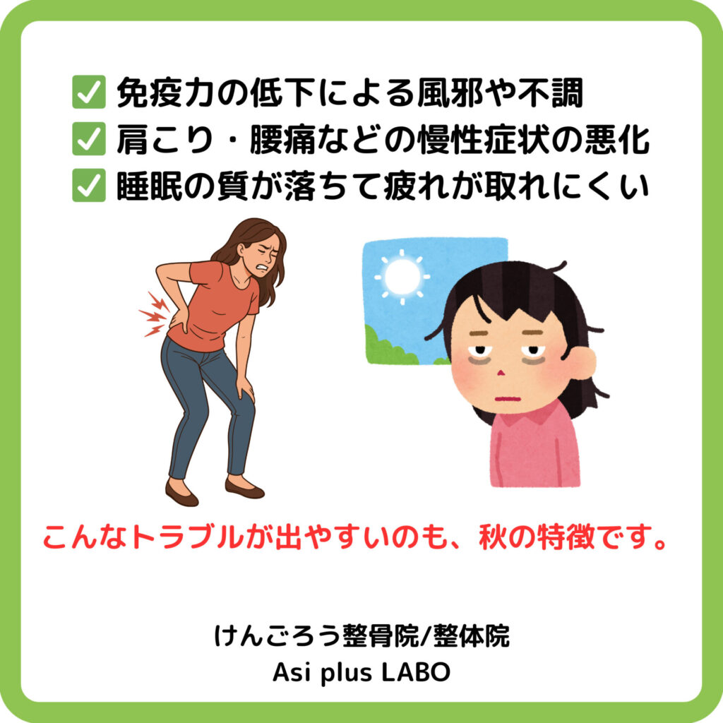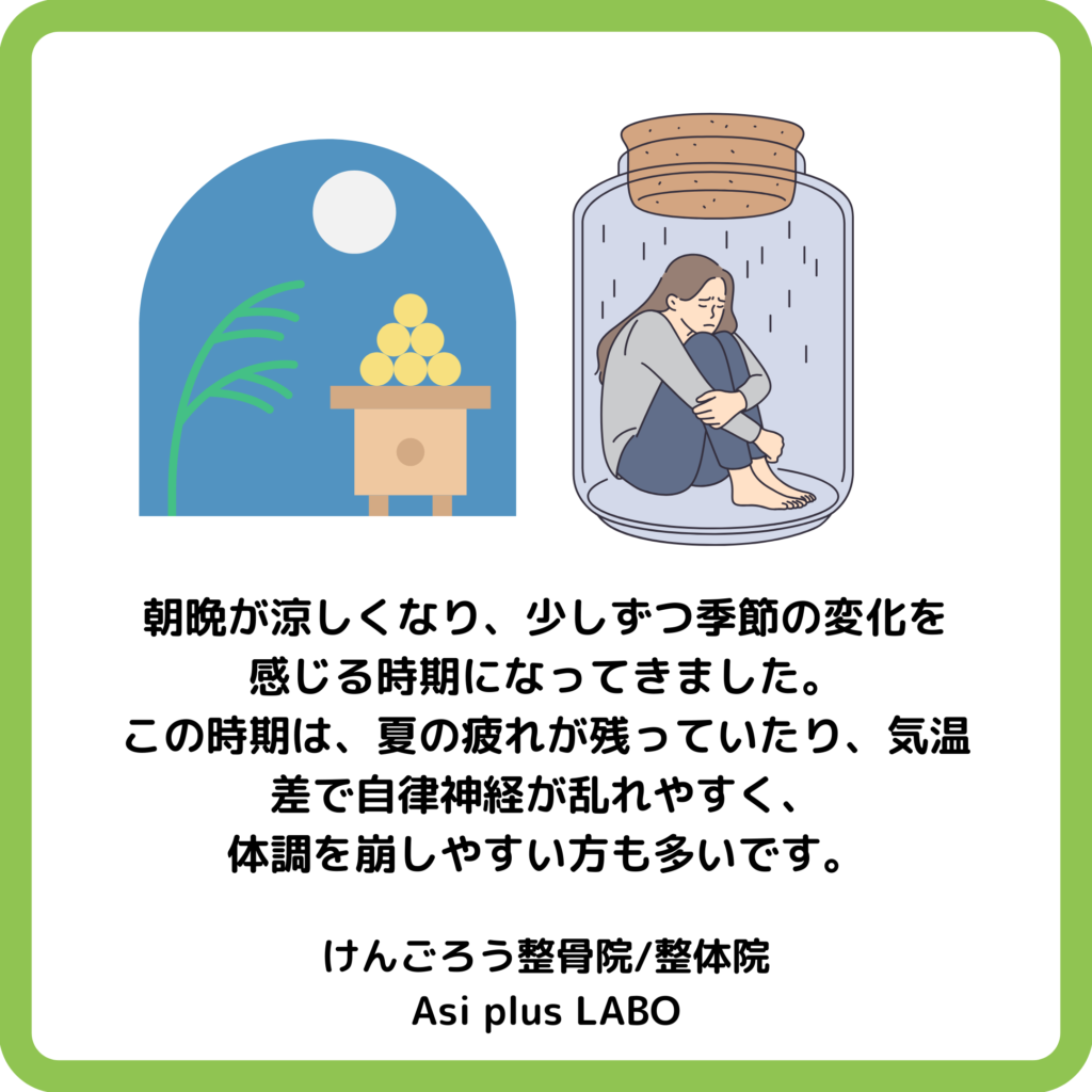 この時期は、夏の疲れが残っていたり、気温差で自律神経が乱れやすく、体調を崩しやすい方も多いです。