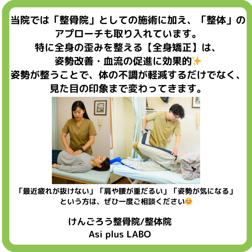 特に全身の歪みを整える【全身矯正】は、姿勢改善・血流の促進に効果的✨